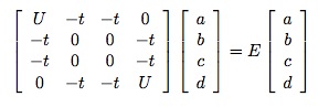 Because the electrons are conserved in number and cannot change their spin when they hop, these configurations split up into different unconnected groups, which we can solve separately. The configuration with no electrons is not connected to any other configuration, and has an energy of zero. The two configurations with an up electron are connected to each other, as are the two configurations with a single down electron. Let’s solve the stationary Schroedinger equation for the single up electron case.